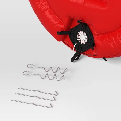 Illuminate your garden or backyard with the vintage, festive playfulness of this 10-Foot Christmas Lighted Inflatable Santa in Sleigh Over the House from Wondershop™. Made from polyester, this inflatable decoration showcases Santa in his sleigh above a snowy house with Christmas trees and a snowman, designed in vibrant red, white and green colors. Powered by an electrical plug, it lights up beautifully to create an eye-catching centerpiece for your seasonal setup and is suitable for indoor and outdoor use. Plus, it comes with eight stakes for easy setup if you decide to place it in your yard.