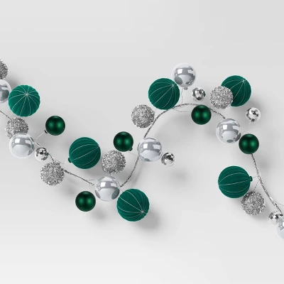 Decorate your holiday tree in a festive style with the Christmas Flocked and Glitter Shine Garland from Wondershop™. This decorative garland features green and silver balls with glittery and flocked accents for a glam look. Made of plastic, this garland elevates the look of your seasonal decor as you wrap it around the tree.