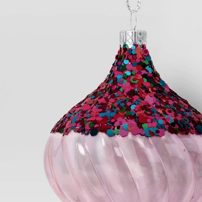 Add classic festive charm to your decor with this Swirl Onion Light Pink Ornament from Wondershop™. This hanging ornament showcases a swirl onion design in light pink, embellished with multicolor sequins on the top for a stunning look. Intended for indoor decorative use with polystyrene and PET material, the ornament also features a silver-tone cap with a coordinating top loop for easy hanging on the branches of your tree.